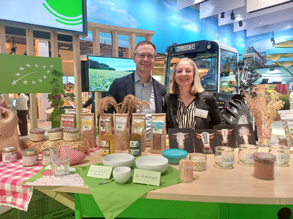 Wir präsentierten unsere Produkte wie Getreide, Leinsamen, Leindotter, Hirse etc. und natürlich unsere Bio-Wurst. Am Stand besuchte uns ein breit gemischtes Publikum: Fachleute, Landwirte, Schüler und viele, die sich einfach freuten, unsere Wurst zu probieren. Es waren zwei schöne Tage in Berlin.