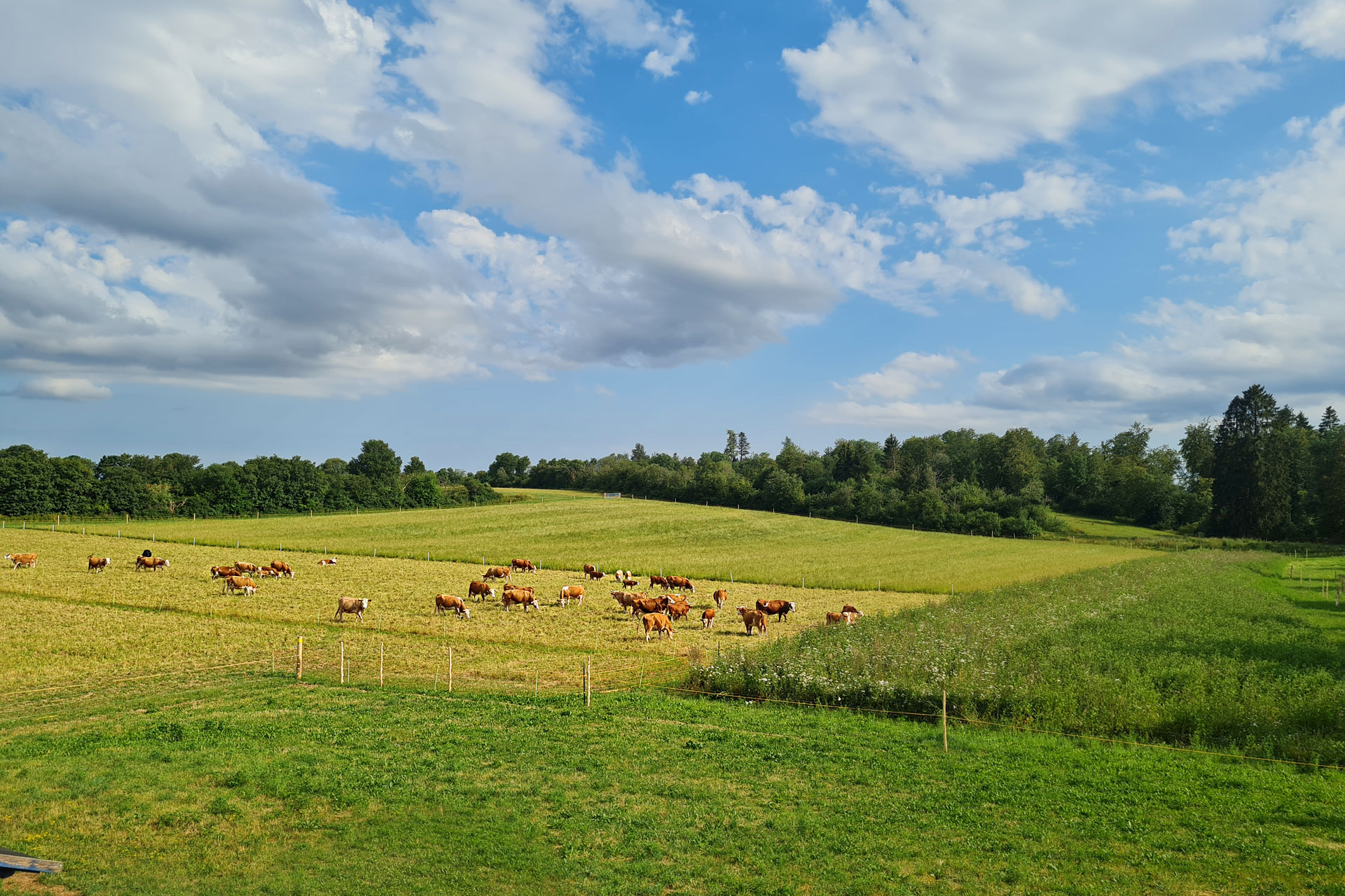 Unsere Kühe sind im Sommer und bei gutem Wetter auf der Weide. Diese liegt direkt am Stall. Die Tiere können auswählen, ob sie sich dort oder in unserem schönen Freiluftstall aufhalten möchten.