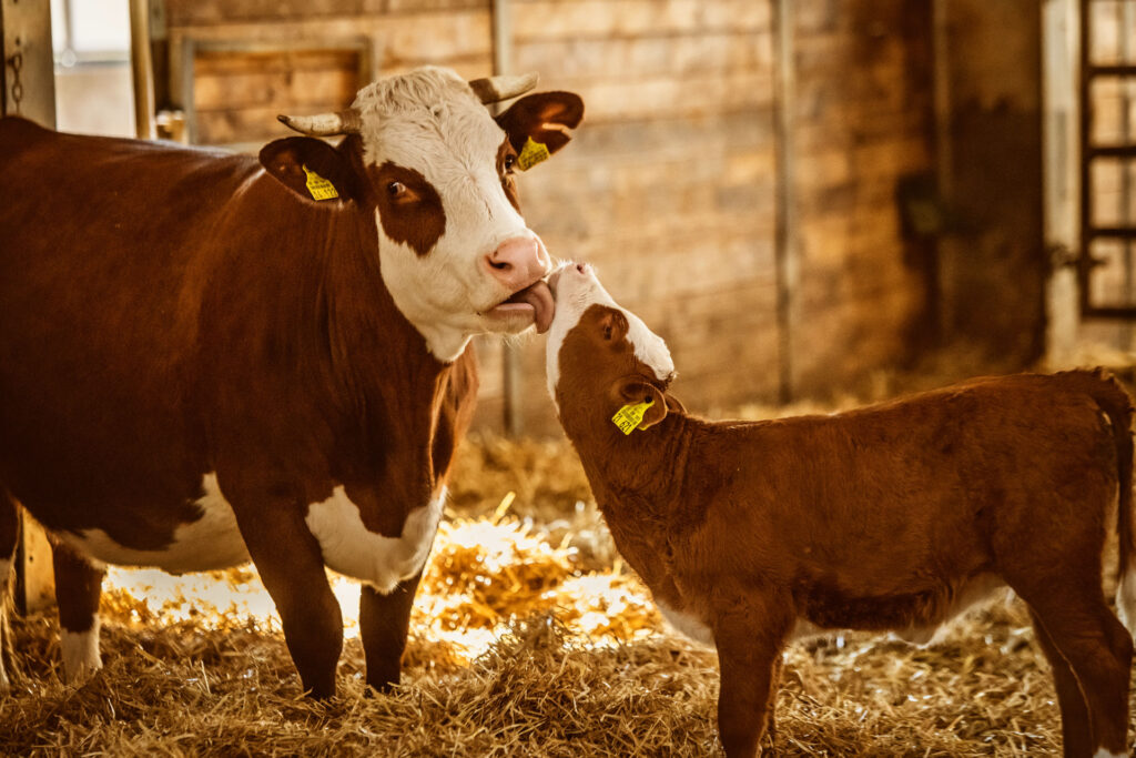 davon 32 Mutterkühen mit ihren Kälbern und unserem japanischen Wagyu-Bullen Franz. Mutterkuhhaltung bedeutet, dass die Kälber bis ca. 8 Monate bei ihrer Mutter bleiben und gesäugt werden. Wir melken die Tiere also nicht, sondern vermarkten nur das Fleisch in unserem Hofladen und an verschiedene Gastronomiebetriebe.